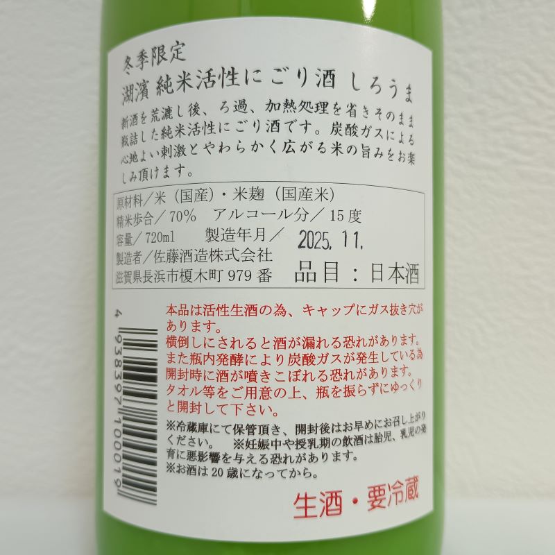今宵の晩酌はこちら。佐藤酒造さんの湖濱「しろうま」純米活性にごり酒です。
