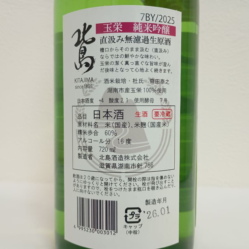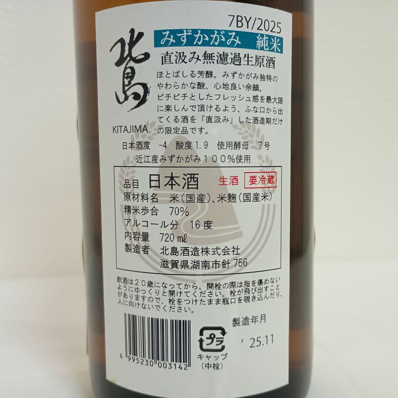 今宵の滋賀酒はこちら。北島酒造さんの北島「みずかがみ」直汲み 純米 無濾過生原酒です。