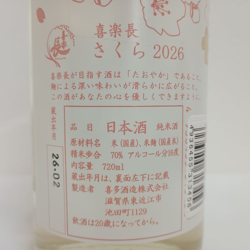 今宵の滋賀酒はこちら。喜多酒造さんの喜楽長「さくら 2026」純米酒です。