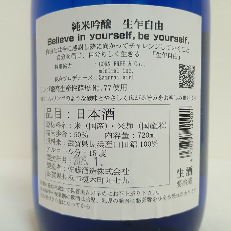 今宵の滋賀酒はこちら。佐藤酒造さんの「生乍自由」純米吟醸です。