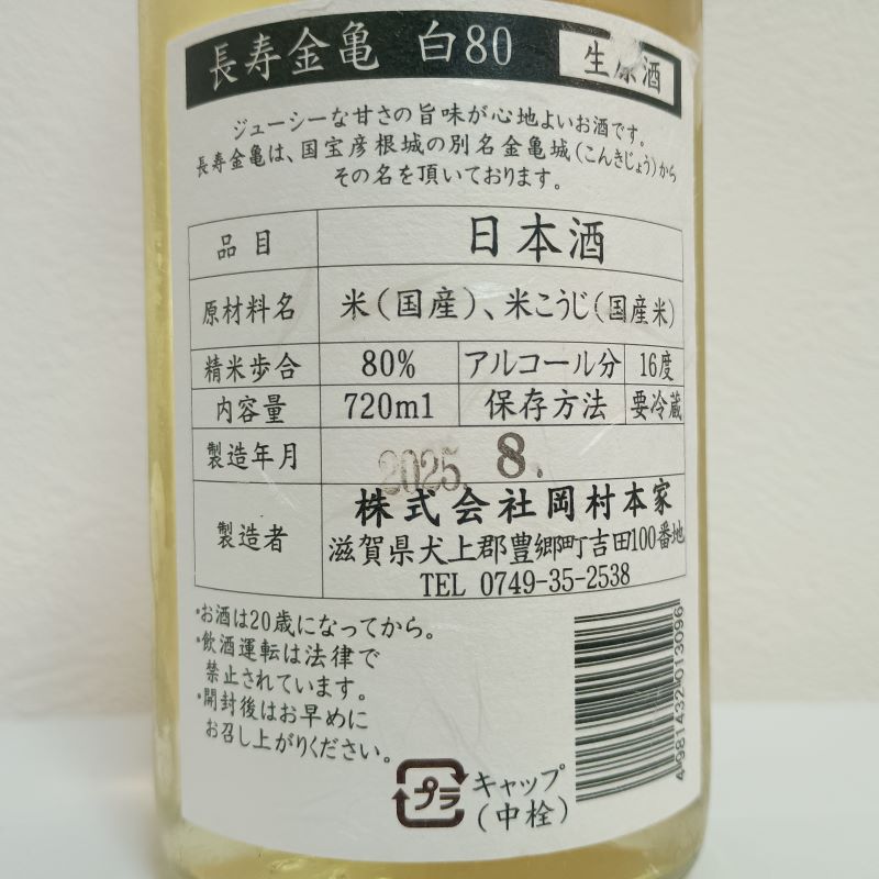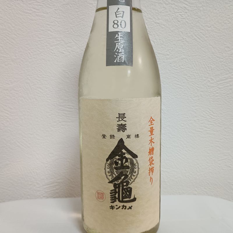 今宵の滋賀酒はこちら。岡村本家さんの長寿金亀「白80」生原酒です。