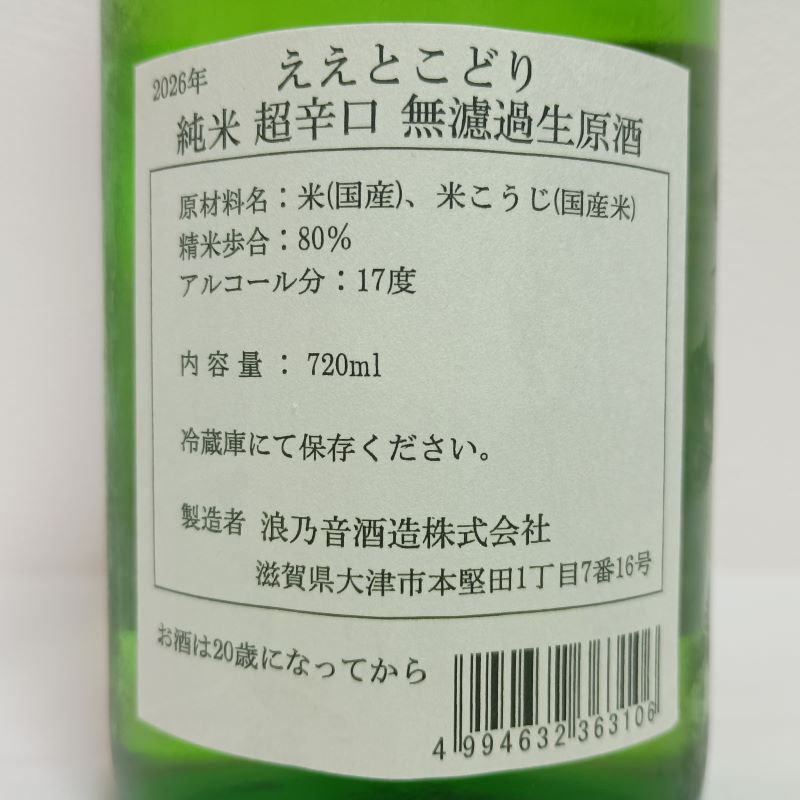 今宵の滋賀酒はこちら。浪乃音酒造さんの浪乃音「ええとこどり 純米超辛口」無濾過生原酒です。