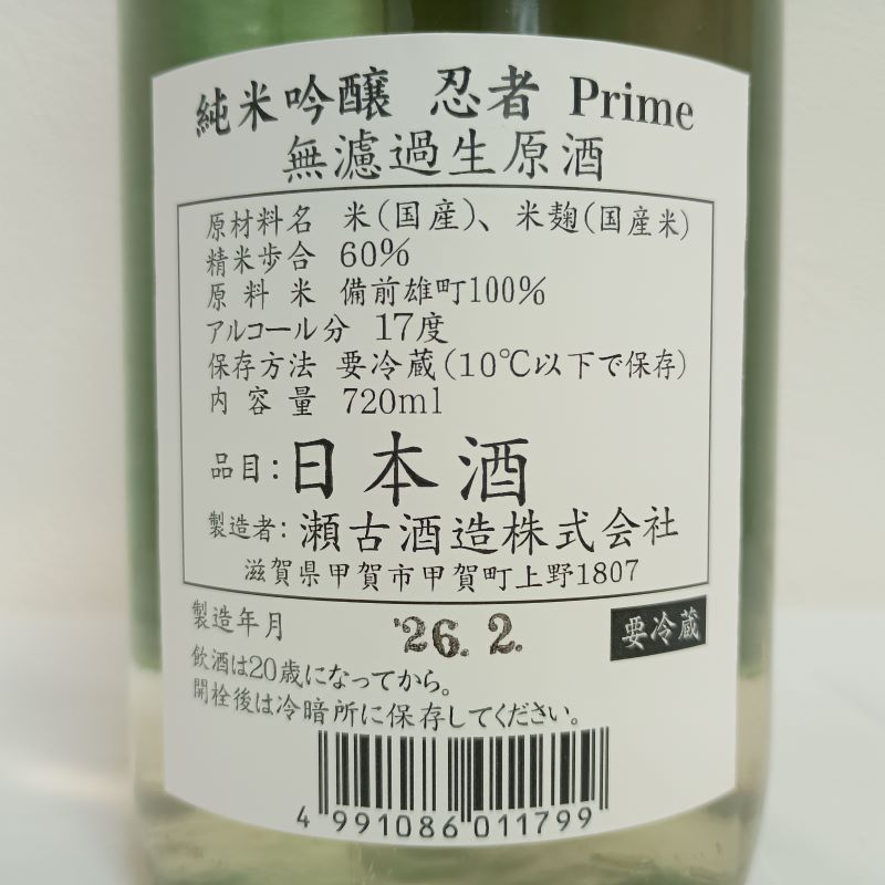 今宵の滋賀酒はこちら。瀬古酒造さんの忍者 Prime「備前雄町」純吟 無濾過生原酒です。