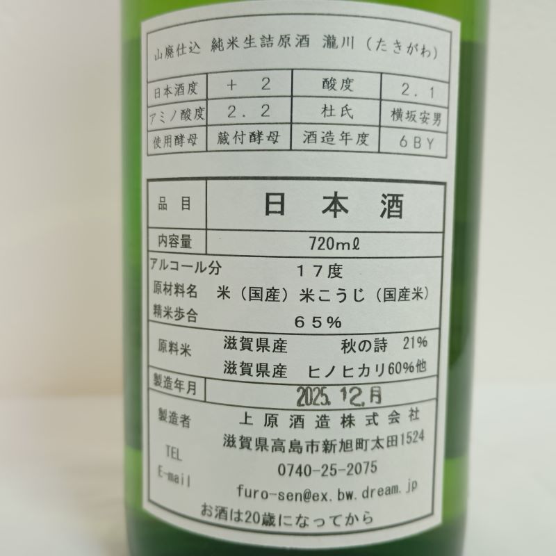 今宵の滋賀酒は、上原酒造さんの瀧川「山廃仕込 純米 生詰原酒」です。