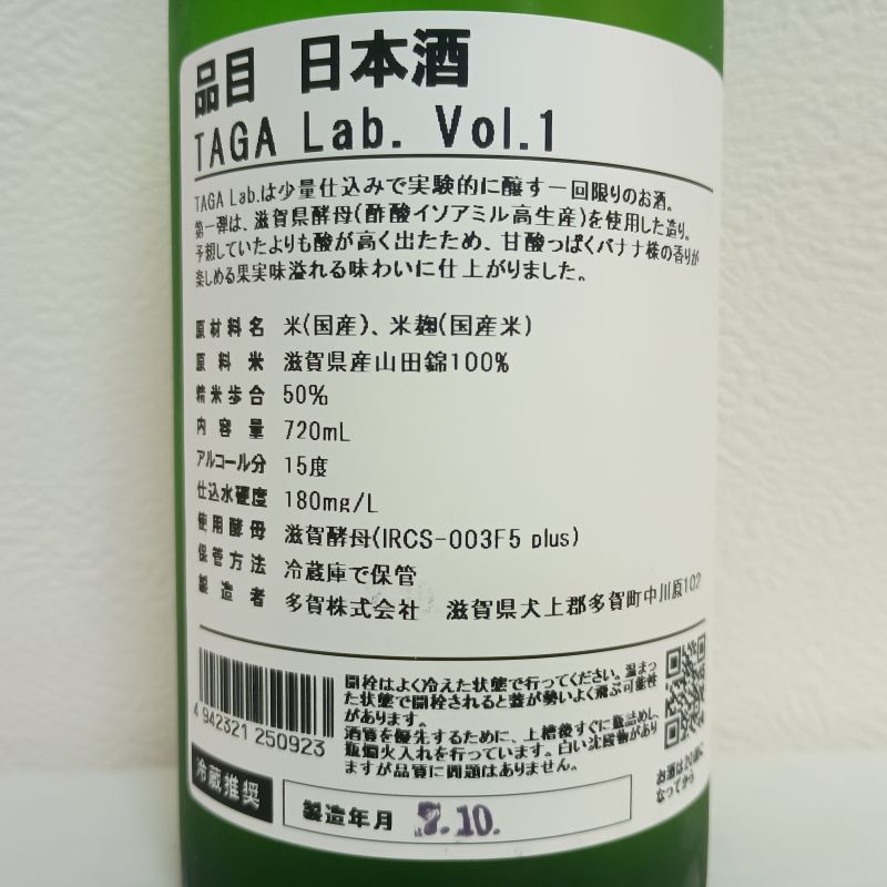 今宵の滋賀酒はこちら。多賀さんの多賀「TAGA Lab. Vol.1」です。