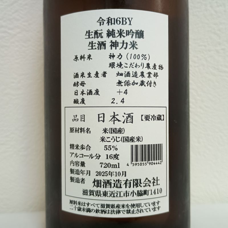 今宵の滋賀酒はこちら。畑酒造さんの喜量能「神力米 生酛 純米吟醸 生原酒」です。