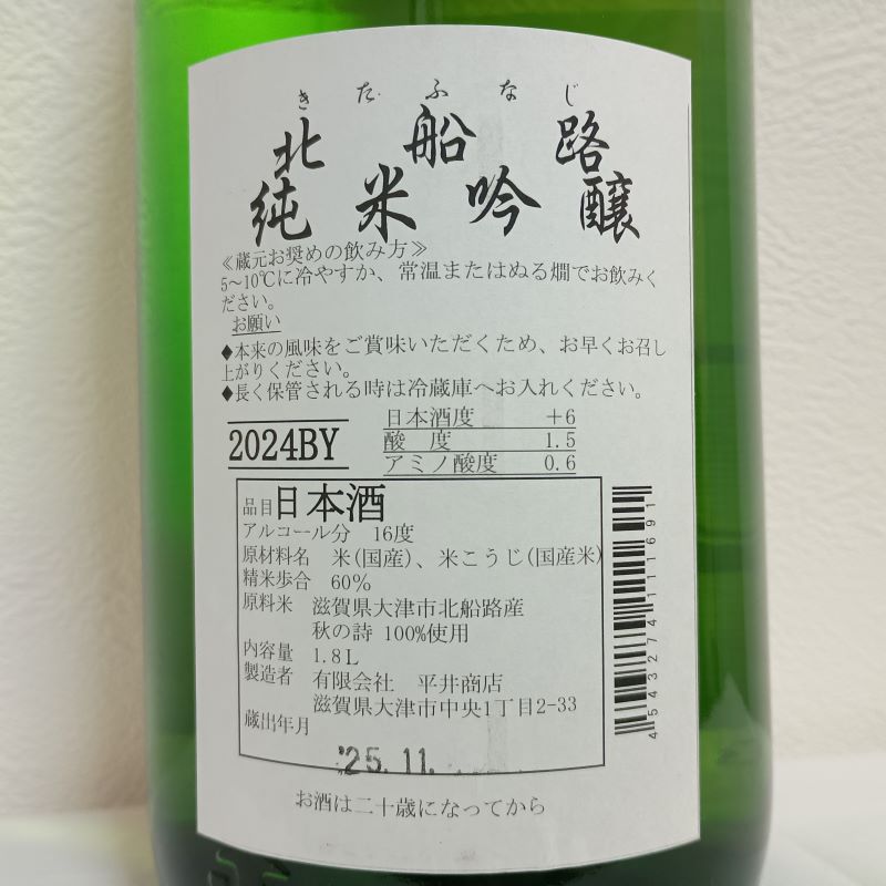 今宵の滋賀酒はこちら。平井商店さんの北船路「純米吟醸」です。