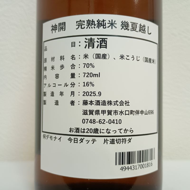 今宵の滋賀酒はこちら。藤本酒造さんの神開「完熟純米 幾夏越し」です。
