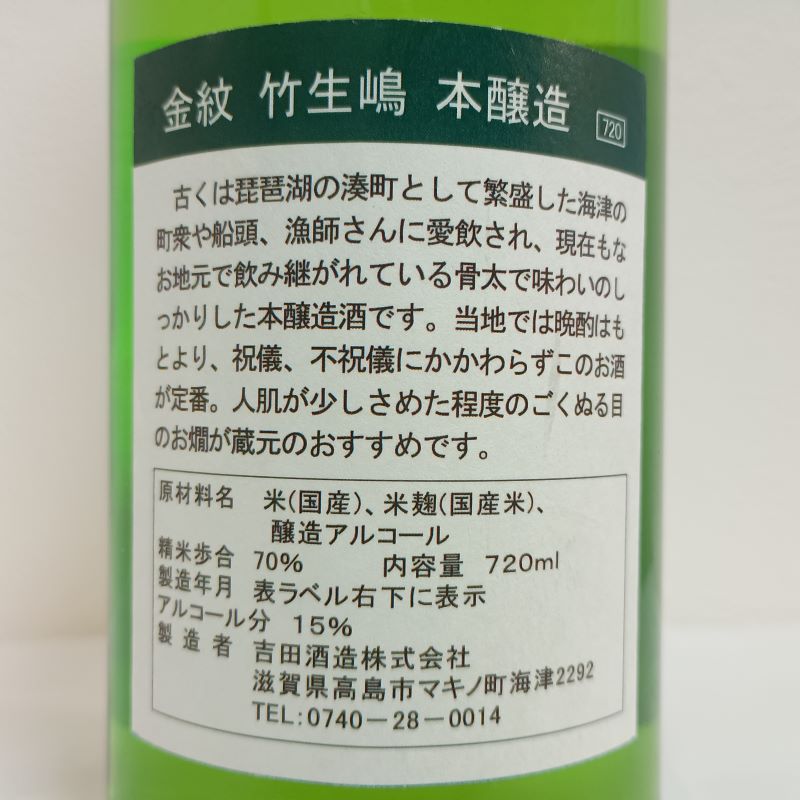 今宵の滋賀酒はこちら。吉田酒造さんの竹生嶋「金紋 本醸造」です。